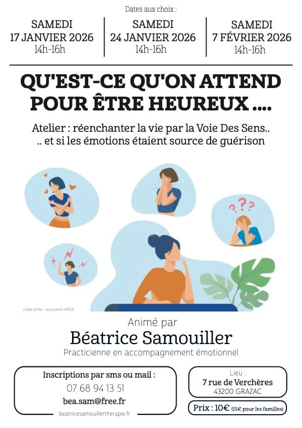 Infirmière de formation, actuellement thérapeute à Grazac, je vous propose un atelierinteractif sur : « les émotions, gestion, stockage, ou résolution ».